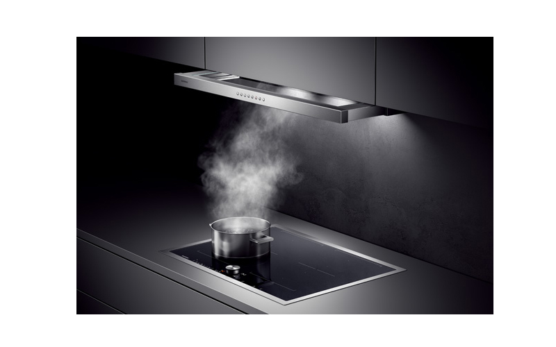 フラットキッチンフードは、インテリジェントで省スペースなソリューションです。幅90cmの範囲内に楽に収まり、目立たず、拡張性があり、静かです。巧みなメカニズムによって戸棚を超えて開きますが、オプションのローイングフレームを使えば、フードを完全に隠すことができます。